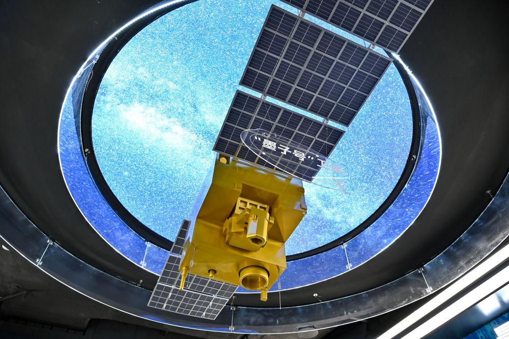 在位于安徽省合肥市的中電信量子信息科技集團(tuán)有限公司科技體驗館內(nèi)拍攝的“墨子號”量子衛(wèi)星模型(2025年7月1日攝)。新華社記者 張鋮 攝