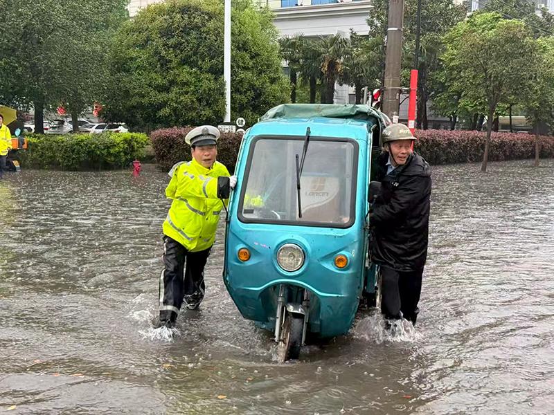 仙桃市公安局根據(jù)積水深度分級落實“警示、限行、封控”管理措施,民警輔警化身“推車俠”,冒雨救助拋錨車輛。4月9日上午,民警輔警在巡邏途中發(fā)現(xiàn)被大風(fēng)刮倒、橫在路面的樹木,迅速開展路面清障,保障轄區(qū)道路通行安全。