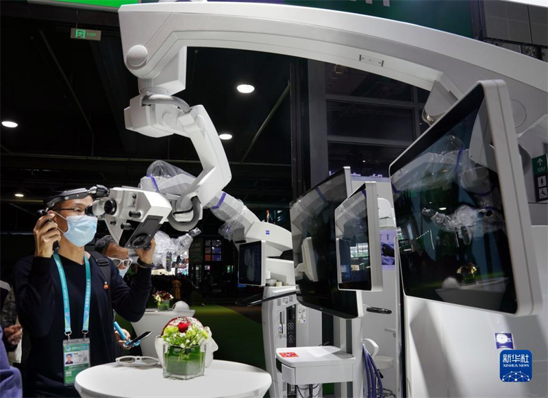 在第三屆中國國際進(jìn)口博覽會醫(yī)療器械及醫(yī)藥保健展區(qū)蔡司集團(tuán)展臺,參觀者體驗(yàn)手術(shù)顯微鏡(2020年11月6日攝)。新華社記者 劉穎 攝