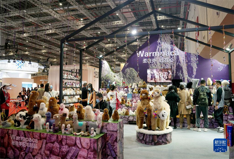 第四屆中國國際進(jìn)口博覽會消費(fèi)品展區(qū)的秘魯羊駝毛玩偶展臺(2021年11月6日攝)。新華社記者 劉穎 攝