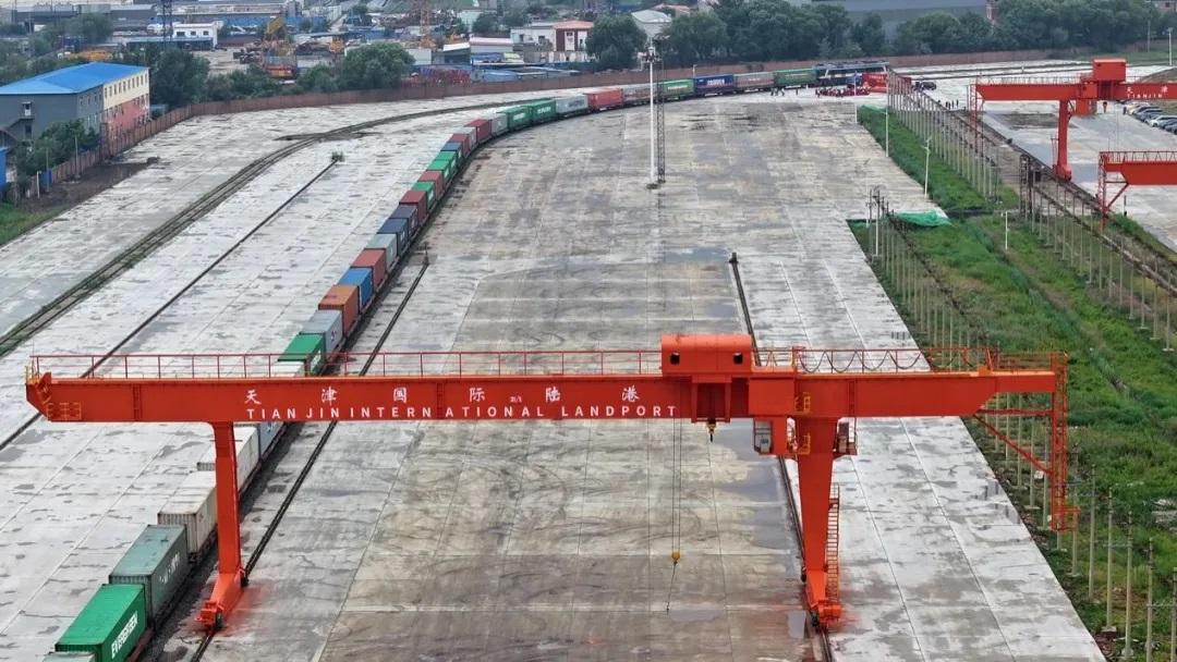 7月1日,列車(chē)在天津國(guó)際陸港準(zhǔn)備出發(fā)(無(wú)人機(jī)照片)。新華社記者 李然 攝