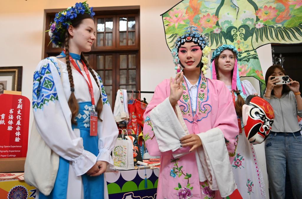 8月6日,上合組織國(guó)家青年學(xué)生在天津體驗(yàn)京劇藝術(shù)。新華社記者李然攝