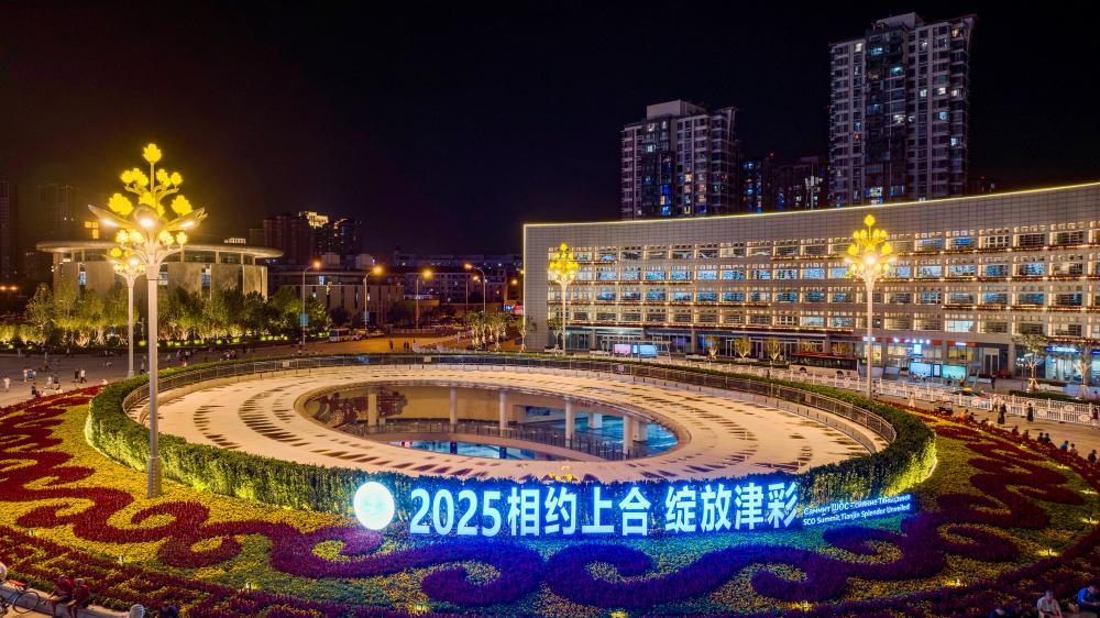 這是8月22日拍攝的位于天津站后廣場(chǎng)的“2025相約上合 綻放津彩”標(biāo)識(shí)(無(wú)人機(jī)照片)。新華社記者趙子碩攝
