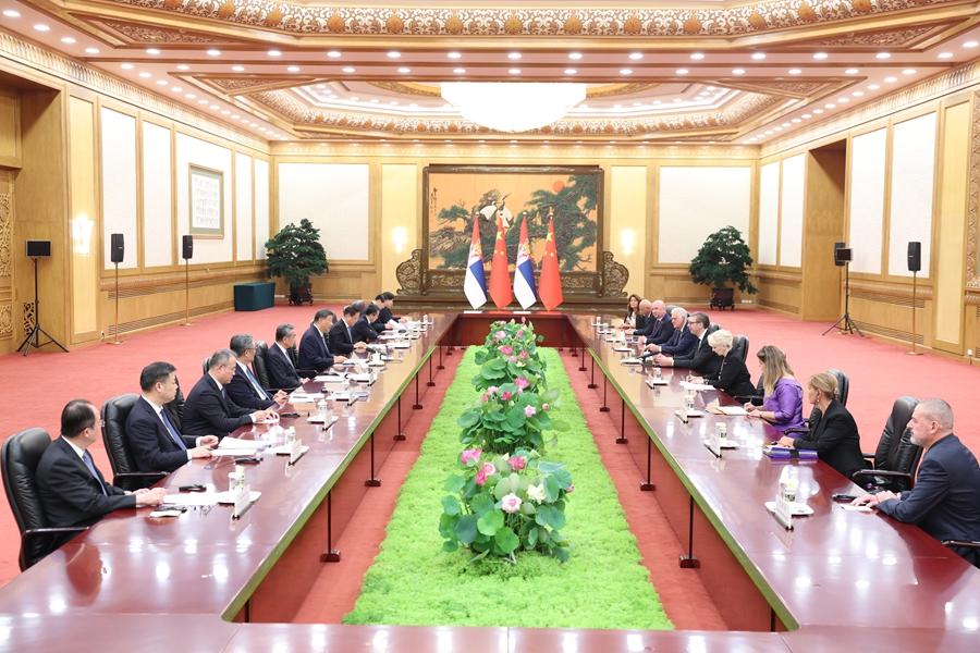 9月4日下午,國(guó)家主席習(xí)近平在北京人民大會(huì)堂會(huì)見(jiàn)來(lái)華出席紀(jì)念中國(guó)人民抗日戰(zhàn)爭(zhēng)暨世界反法西斯戰(zhàn)爭(zhēng)勝利80周年活動(dòng)的塞爾維亞總統(tǒng)武契奇。新華社記者 黃敬文 攝