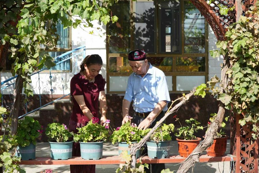 2025年8月30日,買買提江·吾買爾(右)正和女兒打理院里綠植。新華社記者 高晗 攝