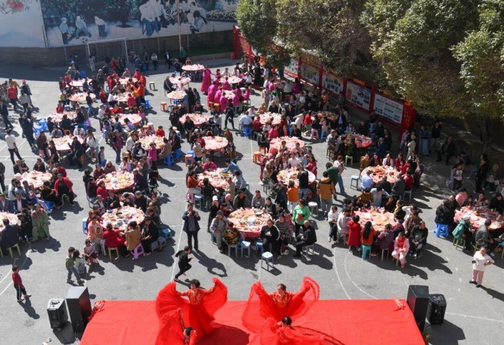人們在烏魯木齊市天山區(qū)固原巷社區(qū)舉辦的活動中品嘗百家宴,欣賞文藝演出。新華社記者 王菲 攝