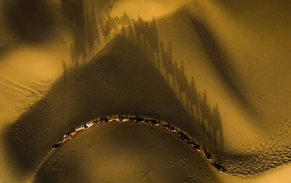 游客騎著駱駝在尉犁縣羅布人村寨欣賞沙漠美景(無人機(jī)照片)。新華社記者 趙戈 攝