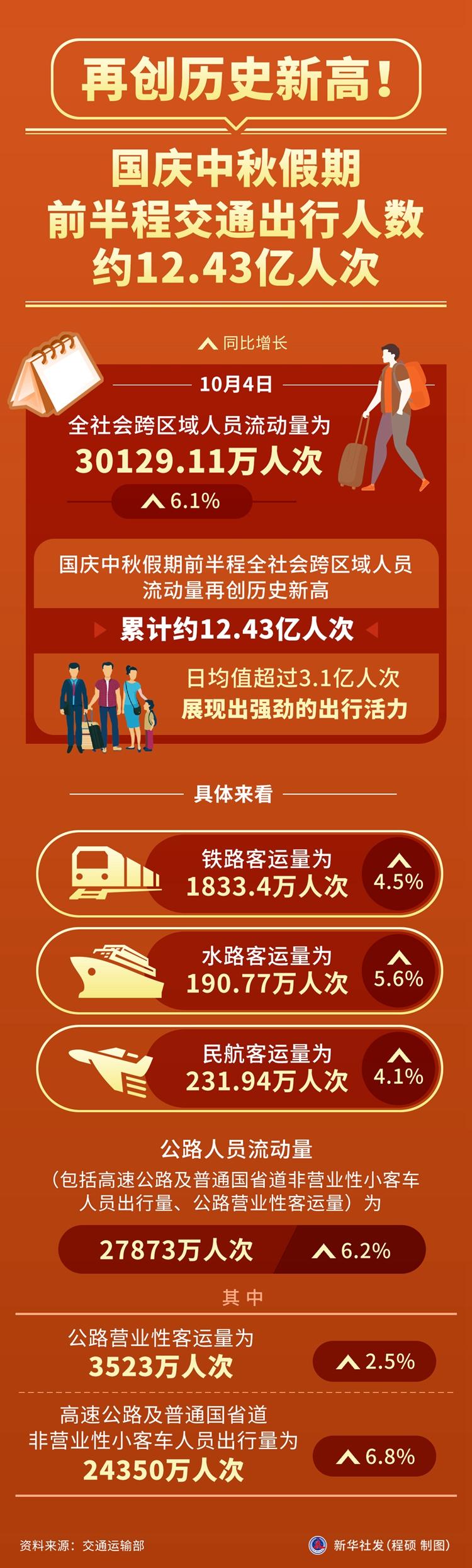 新華社北京10月5日電(記者葉昊鳴)記者5日從交通運(yùn)輸部獲悉,10月4日,全社會(huì)跨區(qū)域人員流動(dòng)量為30129.11萬人次,同比增長6.1%。國慶中秋假期前半程全社會(huì)跨區(qū)域人員流動(dòng)量再創(chuàng)歷史新高,累計(jì)約12.43億人次,日均值超過3.1億人次,展現(xiàn)出強(qiáng)勁的出行活力。