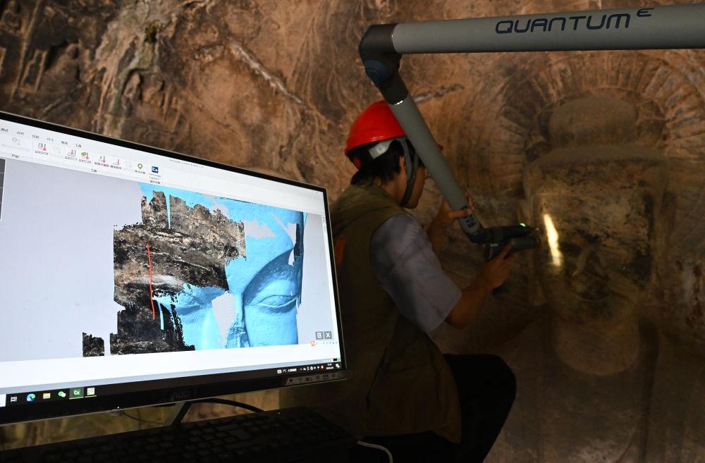 2025年4月9日,武漢大學(xué)文化遺產(chǎn)智能計算實(shí)驗室團(tuán)隊成員在河南洛陽龍門石窟魏字洞使用關(guān)節(jié)臂掃描儀對佛像進(jìn)行數(shù)字化掃描。從2005年起,龍門石窟研究院開始為龍門石窟建立數(shù)字化檔案,借助激光掃描、高清攝影等技術(shù)手段收集文物數(shù)據(jù),以數(shù)字的形式留存千年石刻群的風(fēng)貌,致力于讓這一規(guī)模宏大、氣勢磅礴的石窟瑰寶“芳華永駐”。
