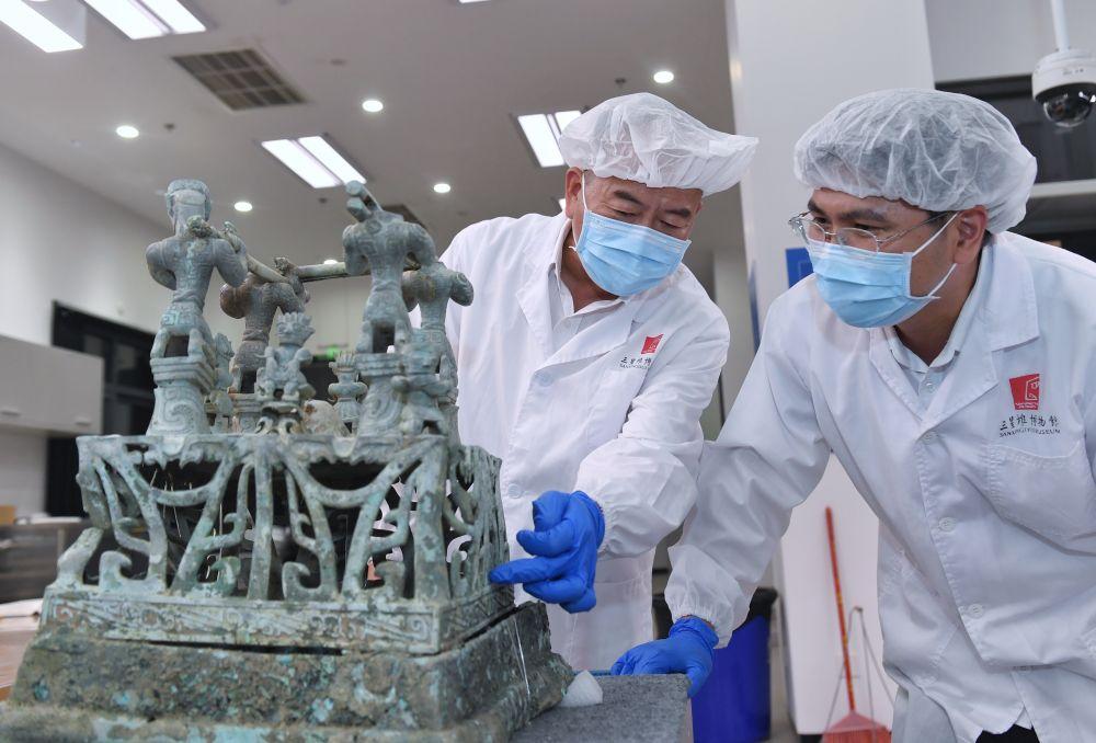 2023年5月30日,在四川三星堆博物館文物保護(hù)和修復(fù)中心,文物修復(fù)師郭漢中(左)與同事討論神壇底座修復(fù)方案。郭漢中從事文物修復(fù)工作已40余年,深度參與了三星堆祭祀坑的發(fā)掘工作,累計修復(fù)文物6000余件?!按蟾胚€有上萬件文物等著修復(fù),需要一代接著一代往下干。”郭漢中說,他要把平生所學(xué)傳承下去,培養(yǎng)更多人才。