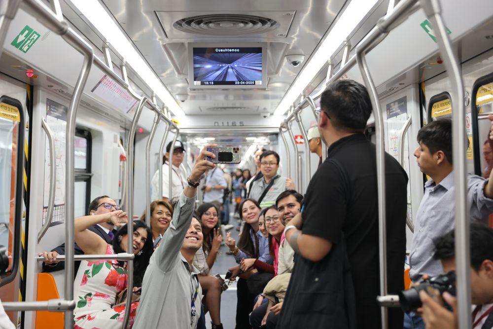 2025年4月23日,在墨西哥首都墨西哥城,媒體記者在地鐵新1號(hào)線列車上合影。當(dāng)日,墨西哥城地鐵新1號(hào)線舉行部分通車儀式,中國(guó)企業(yè)助力全面升級(jí)系統(tǒng)設(shè)備,改善市民通勤體驗(yàn)。