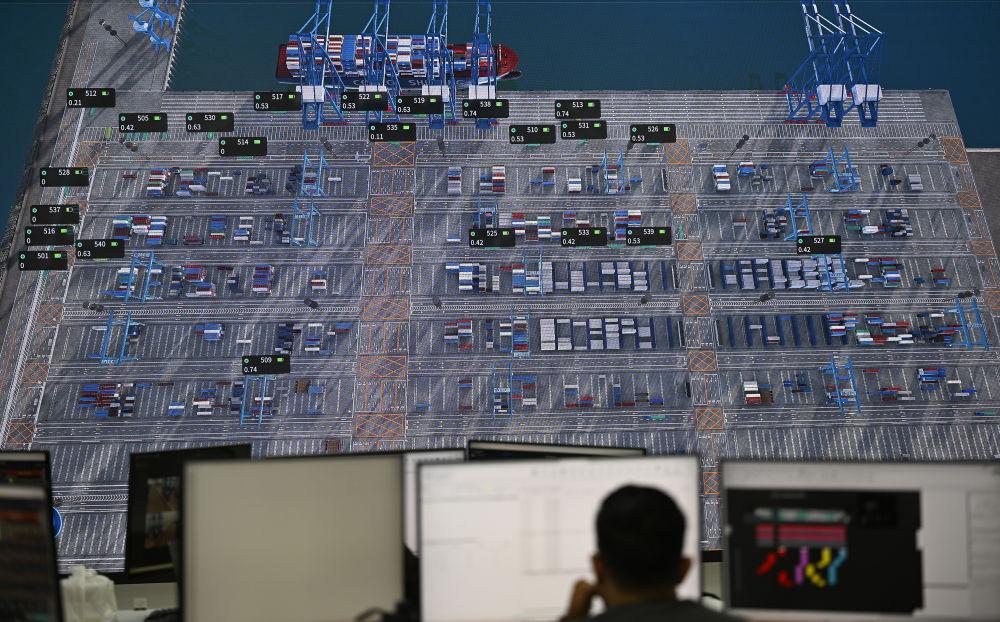 2025年5月16日,在秘魯錢凱港的中遠(yuǎn)海運(yùn)港口秘魯錢凱公司前方運(yùn)營(yíng)大樓,工作人員通過屏幕監(jiān)測(cè)港口運(yùn)行情況。錢凱港是中國(guó)與秘魯共建“一帶一路”標(biāo)志性項(xiàng)目,2024年11月正式開港,成為連接亞洲與拉美最重要的航運(yùn)樞紐之一。