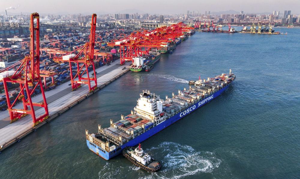 2025年12月5日,在山東港口日照港集裝箱碼頭,滿載集裝箱的船舶駛離港口(無人機照片)。新華社發(fā)(李大偉攝)