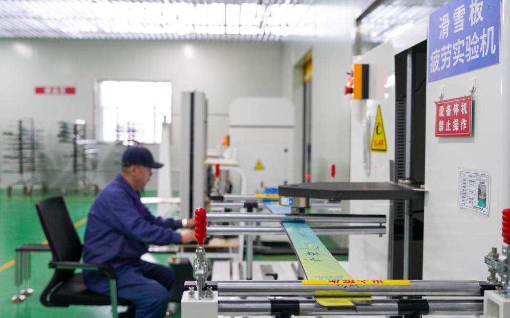 2025年12月4日,在吉林化纖國興復(fù)合材料有限公司的車間內(nèi),工作人員用機(jī)器設(shè)備檢測公司自主研發(fā)生產(chǎn)的碳纖維滑雪板。新華社記者 顏麟蘊(yùn) 攝