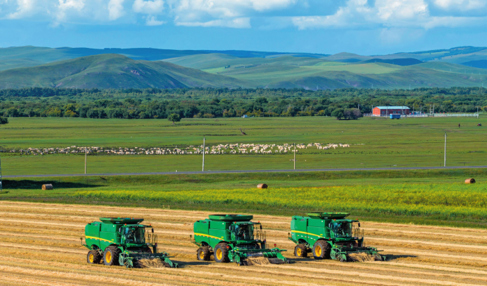 內(nèi)蒙古呼倫貝爾農(nóng)墾拉布大林農(nóng)場(chǎng)的工人駕駛農(nóng)機(jī)收獲小麥(2025年8月20日攝)。馬金瑞攝/本刊
