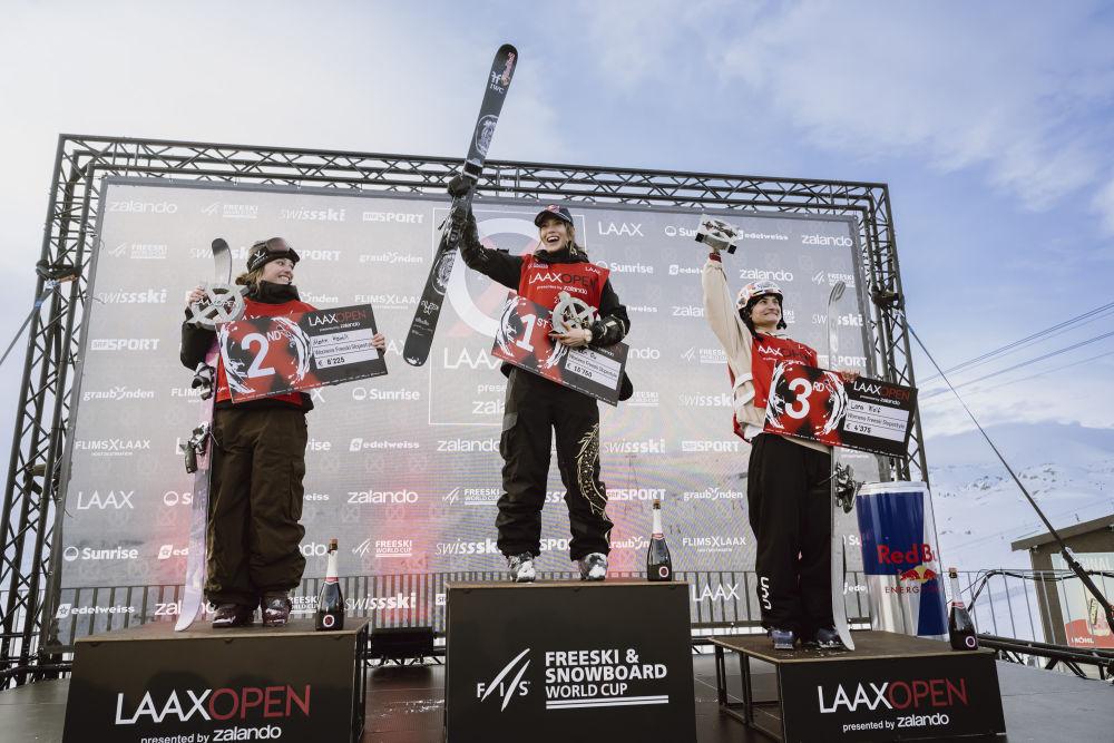 2026年1月17日,在瑞士萊克斯舉行的國(guó)際雪聯(lián)世界杯系列賽中獲得女子自由式滑雪坡面障礙技巧冠軍的谷愛凌(中)在領(lǐng)獎(jiǎng)臺(tái)上。新華社發(fā)(馬塞爾·萊默希特?cái)z)
