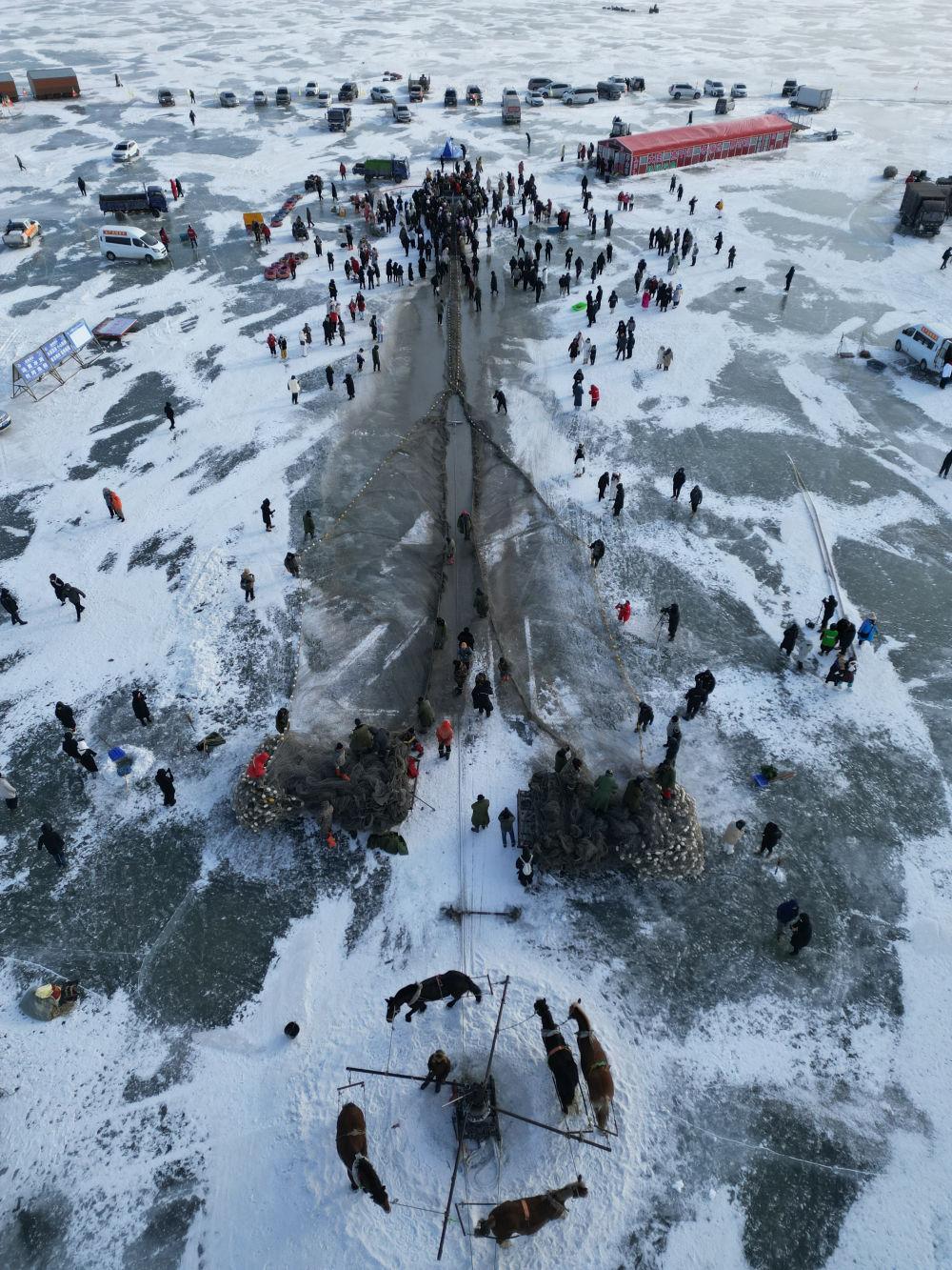 在吉林省松原市,游客在查干湖冰面上觀看冬捕(2026年1月7日攝,無人機(jī)照片)。新華社記者 顏麟蘊 攝