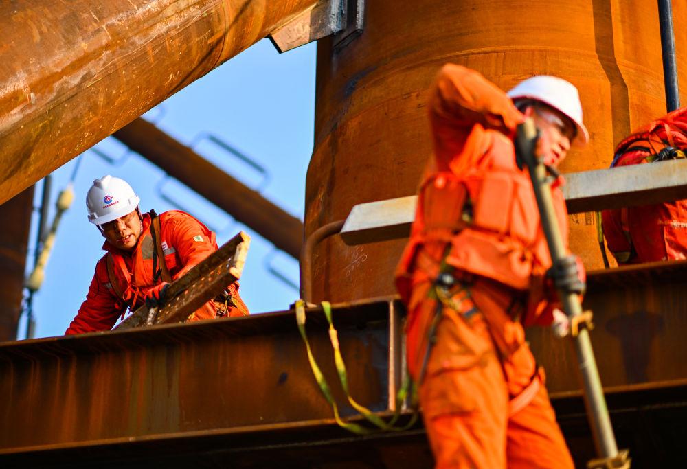 2026年2月13日,工人在位于渤海中部海域的渤中26-6油田開(kāi)發(fā)項(xiàng)目(二期)作業(yè)現(xiàn)場(chǎng)施工。新華社記者 趙子碩 攝