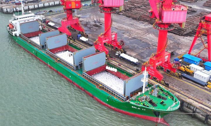 2026年3月18日,在江蘇張家港錦隆重件碼頭,國(guó)際航行船舶在泊位上有序卸運(yùn)進(jìn)口化肥(無(wú)人機(jī)照片)。新華社發(fā)(趙國(guó)政攝)