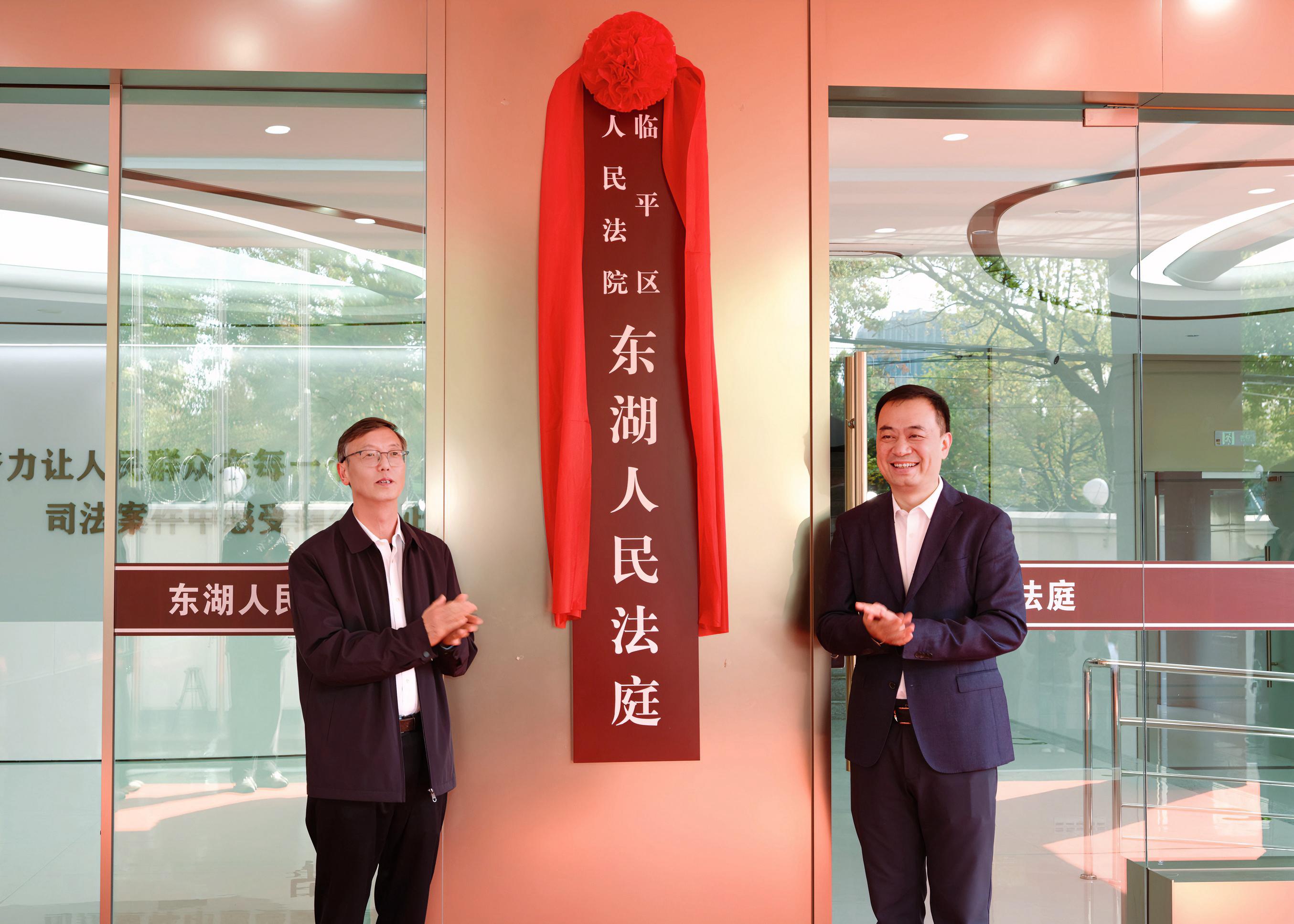 杭州中院黨組書(shū)記、院長(zhǎng)唐學(xué)兵和臨平區(qū)委書(shū)記周徐胤共同為臨平區(qū)人民法院東湖人民法庭揭牌。