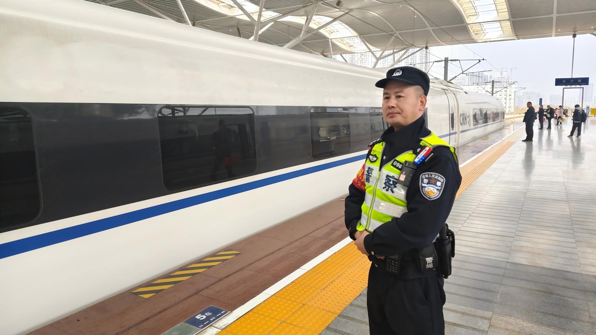 圖為長(zhǎng)沙民警護(hù)航旅客安全。