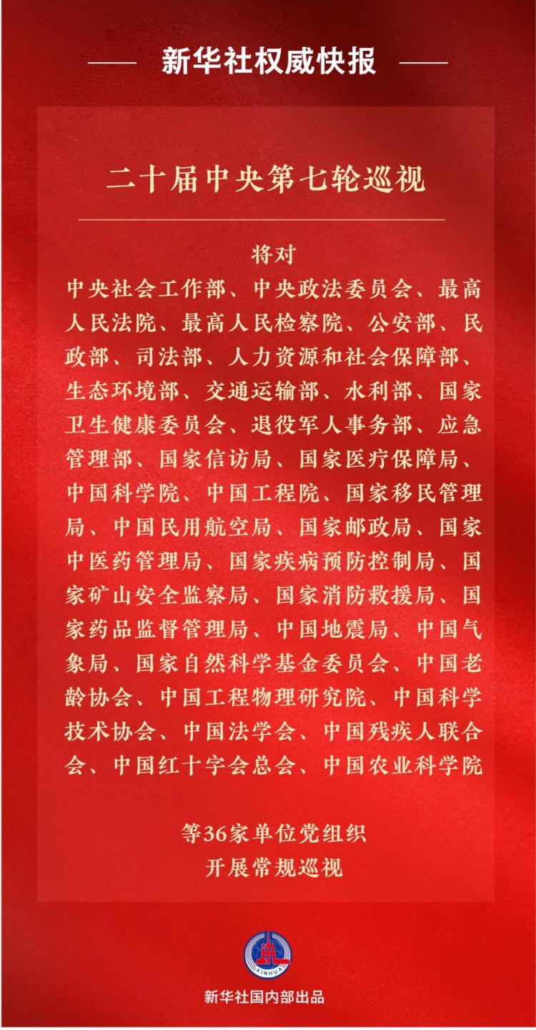 新華社北京4月8日電 經(jīng)黨中央批準(zhǔn),二十屆中央第七輪巡視將對中央社會工作部、中央政法委員會、最高人民法院、最高人民檢察院、公安部、民政部、司法部、人力資源和社會保障部、生態(tài)環(huán)境部、交通運(yùn)輸部、水利部、國家衛(wèi)生健康委員會、退役軍人事務(wù)部、應(yīng)急管理部、國家信訪局、國家醫(yī)療保障局、中國科學(xué)院、中國工程院、國家移民管理局、中國民用航空局、國家郵政局、國家中醫(yī)藥管理局、國家疾病預(yù)防控制局、國家礦山安全監(jiān)察局、國家消防救援局、國家藥品監(jiān)督管理局、中國地震局、中國氣象局、國家自然科學(xué)基金委員會、中國老齡協(xié)會、中國工程物理研究院、中國科學(xué)技術(shù)協(xié)會、中國法學(xué)會、中國殘疾人聯(lián)合會、中國紅十字會總會、中國農(nóng)業(yè)科學(xué)院等36家單位黨組織開展常規(guī)巡視。