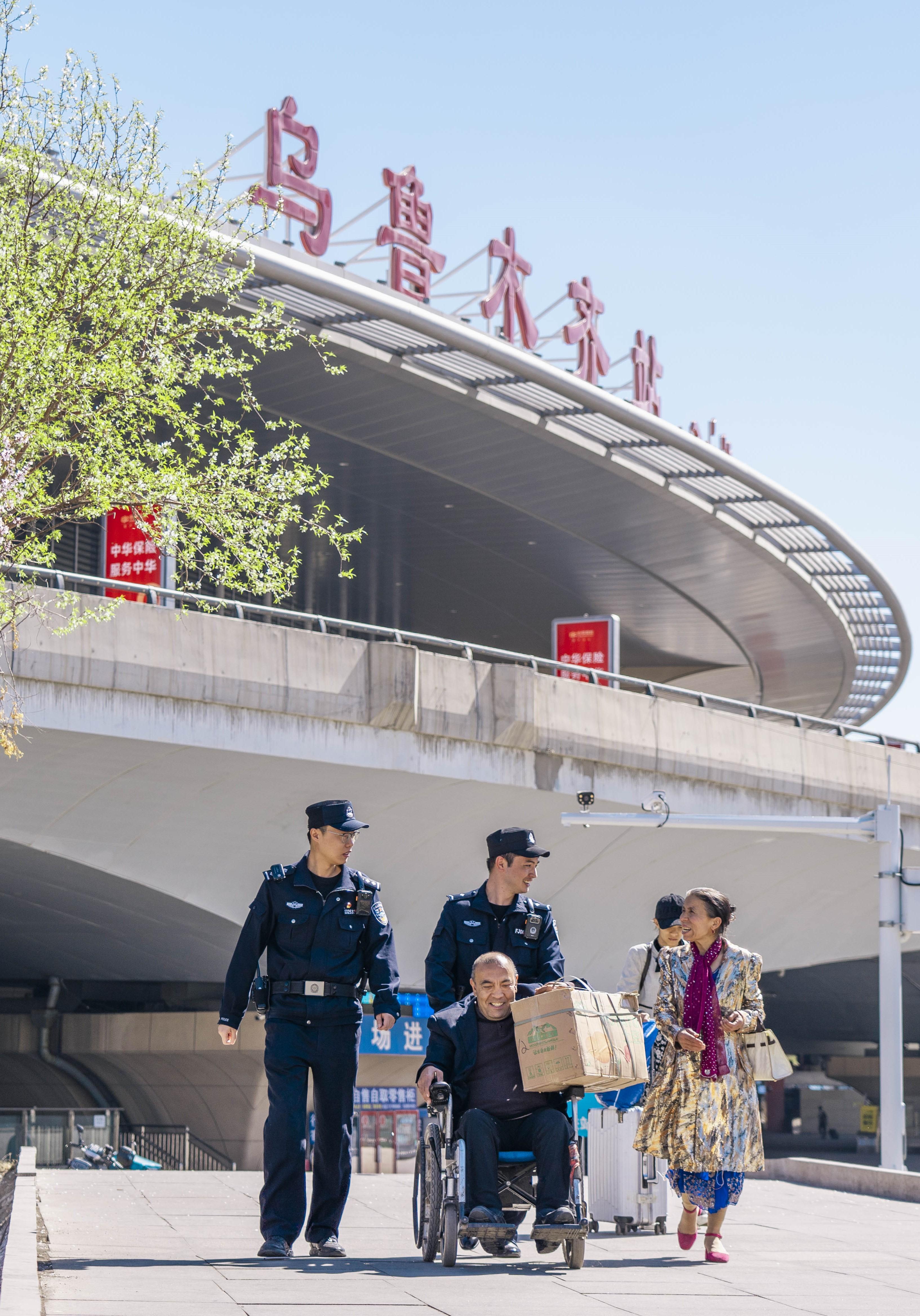 4月8日,春日暖陽下烏魯木齊站站前繁花初綻。烏魯木齊鐵路公安處烏魯木齊站派出所執(zhí)勤民警主動幫扶行動不便的旅客,推輪椅、指引路線,用貼心服務(wù)溫暖出行路,讓春日旅途更安心。