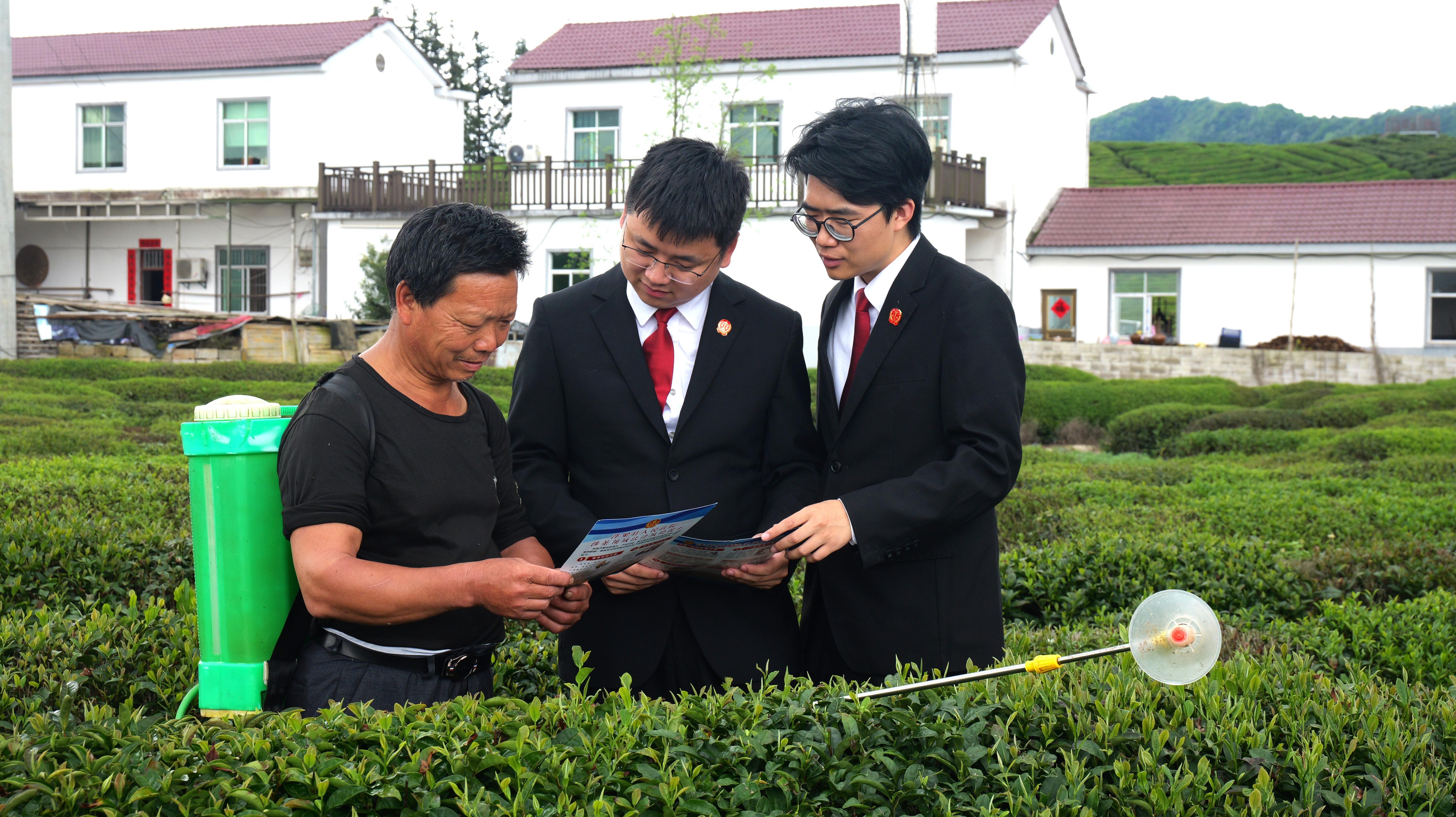 圖為4月14日,法官向茶農(nóng)提示涉茶領(lǐng)域法律風(fēng)險(xiǎn)。