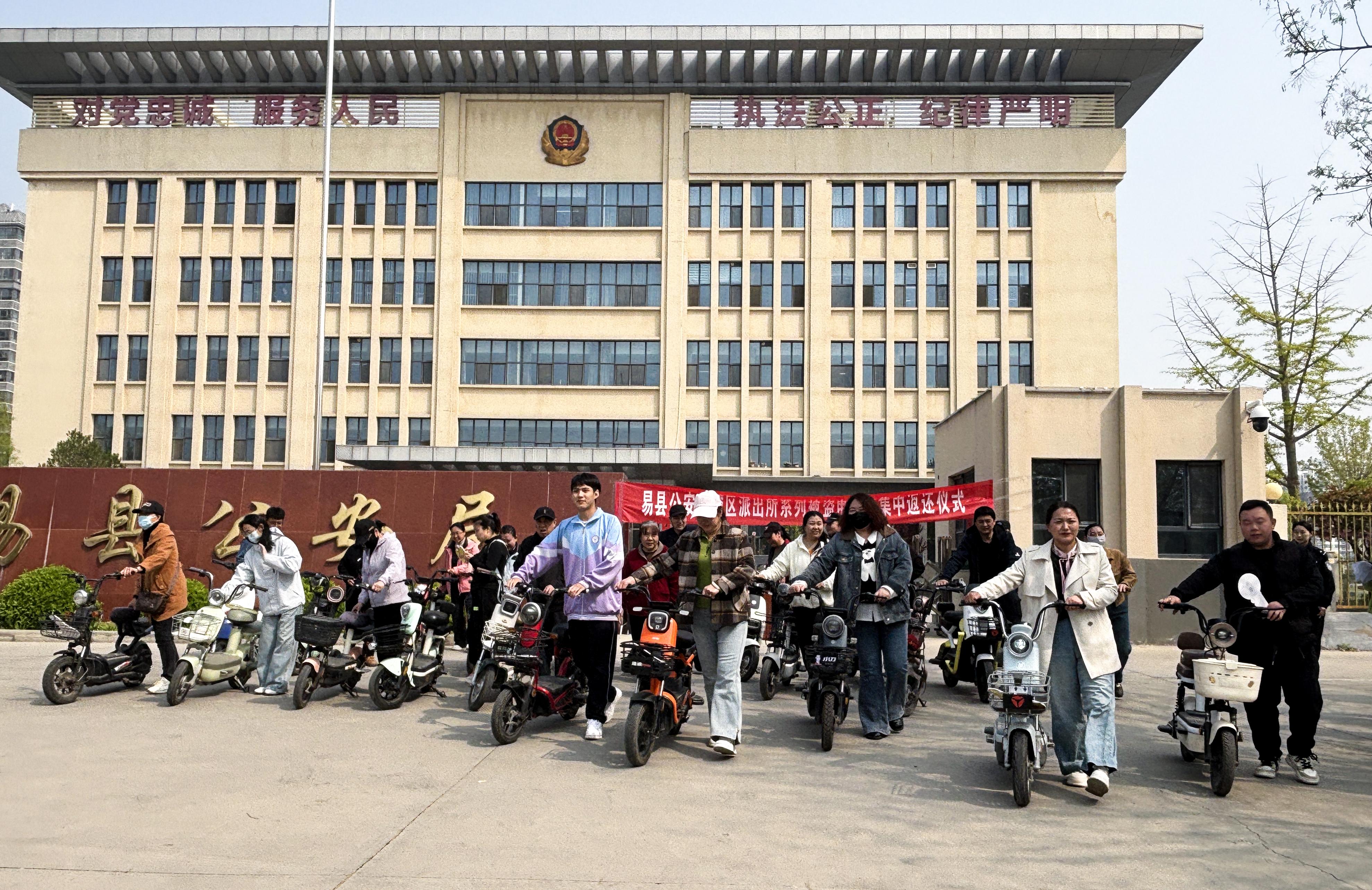 4月15日,河北省保定市易縣公安局舉行涉案電動車集中返還活動,將24輛追回的被盜電動車逐一返還失主。活動現(xiàn)場,24名車主領(lǐng)回了自己失而復(fù)得的電動車,紛紛對民警高效辦案、為民挽損表示感謝。