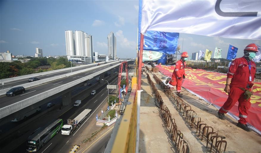 8月15日, 在印度尼西亞勿加泗,工人在印尼雅萬(wàn)高鐵項(xiàng)目一處連續(xù)梁上行走。 印尼雅萬(wàn)高鐵項(xiàng)目1號(hào)梁場(chǎng)雅加達(dá)至萬(wàn)隆方向架梁通道上的控制性工程-DK29處100米跨剛構(gòu)連續(xù)梁于15日下午順利合龍,標(biāo)志著全線(xiàn)首個(gè)架梁通道的形成,為首個(gè)架梁段連續(xù)架梁創(chuàng)造了條件。 新華社發(fā)(祖卡南攝)