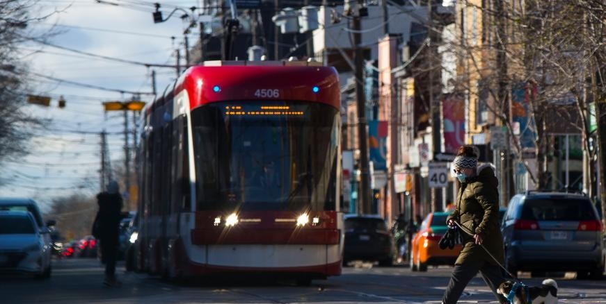 12月6日,在加拿大多倫多,一名戴口罩的女子牽著寵物狗過(guò)馬路。