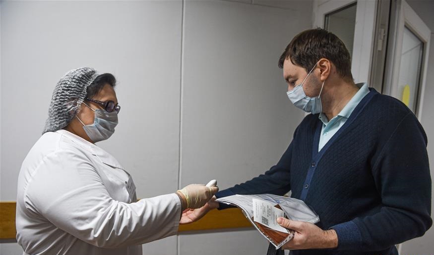 12月8日,在俄羅斯首都莫斯科,醫(yī)護(hù)人員為一名申請(qǐng)接種新冠疫苗的男子測(cè)量體溫。 位于莫斯科的70多個(gè)站點(diǎn)從12月5日起啟動(dòng)新冠疫苗接種工作,自愿申請(qǐng)接種的醫(yī)護(hù)人員、教師等高風(fēng)險(xiǎn)感染人群將優(yōu)先接種該疫苗。 新華社發(fā)(葉甫蓋尼·西尼岑 攝)