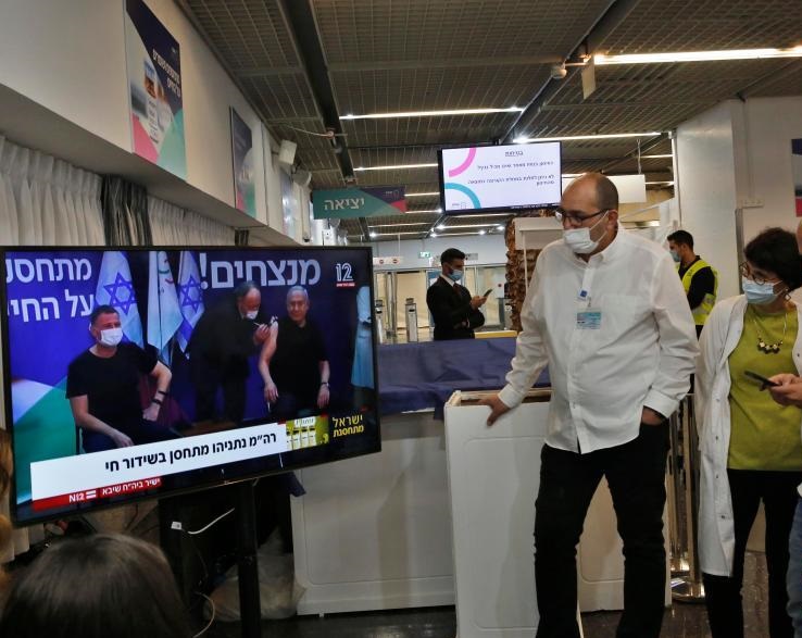 12月19日,在以色列拉馬特甘的謝巴醫(yī)療中心,醫(yī)務(wù)人員觀看以總理內(nèi)塔尼亞胡接種新冠疫苗的電視直播。