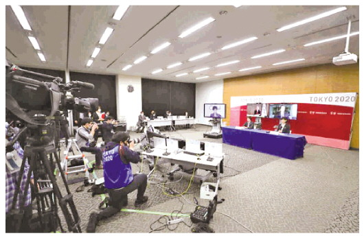 圖為東京奧組委3月舉行五方視頻會(huì)議現(xiàn)場(chǎng)。 新華社記者 杜瀟逸 攝