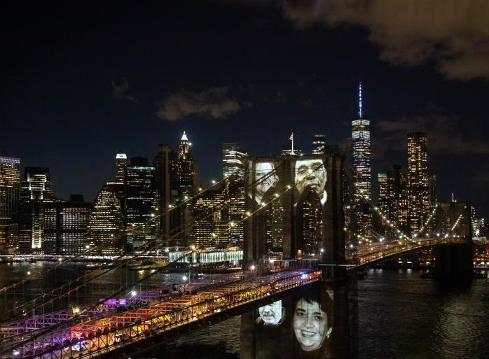 3月14日,新冠逝者的照片在紀念活動上被投射到美國紐約布魯克林大橋上。新華社發(fā)(郭克攝)