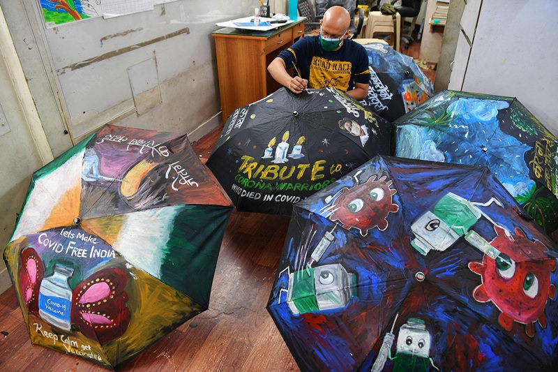 人民網(wǎng)訊 當(dāng)?shù)貢r間6月3日,印度孟買,一所藝術(shù)學(xué)校里的藝術(shù)老師Sagar Kambli繪制新冠疫苗防疫主題雨傘,以提醒學(xué)生們通過接種新冠疫苗防疫。