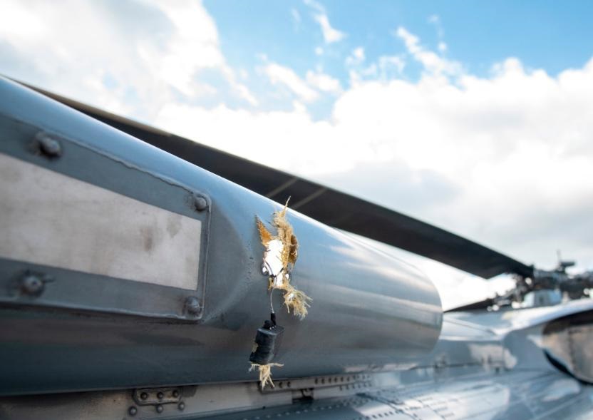 這是6月25日在哥倫比亞?wèn)|北部北桑坦德省省會(huì)庫(kù)庫(kù)塔拍攝的哥倫比亞總統(tǒng)杜克所搭乘的直升機(jī)上的槍孔。