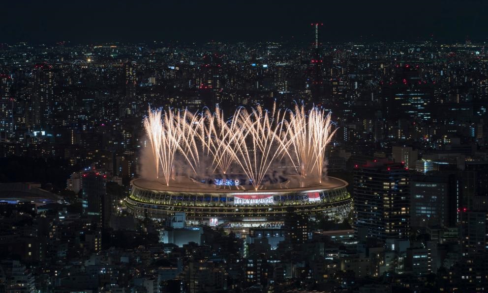 這是7月23日拍攝的東京奧運(yùn)會(huì)開(kāi)幕式的焰火表演。新華社記者 杜瀟逸 攝