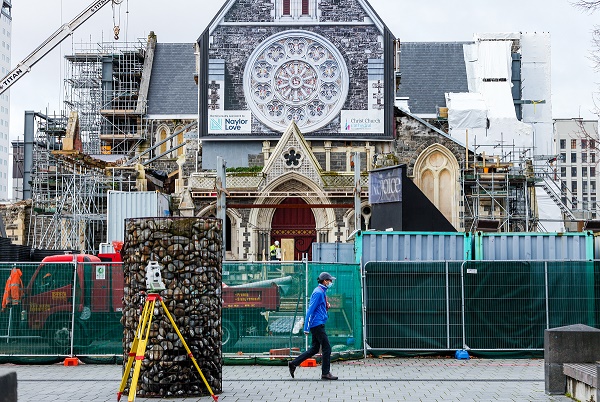 9月8日,在新西蘭南島最大城市克賴斯特徹奇,一名男子戴著口罩從維修中的大教堂前經(jīng)過(guò)。