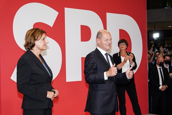 9月26日,在德國首都柏林的德國社會(huì)民主黨(社民黨)總部,社民黨總理候選人肖爾茨(中)向支持者致意。
