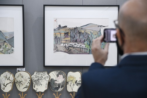 12月2日,馬耳他藝術(shù)協(xié)會(huì)主席阿德里安·馬莫在馬耳他首都瓦萊塔舉行的當(dāng)代中國(guó)畫(huà)藝術(shù)展上拍照。