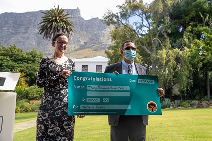 12月6日,在南非立法首都開普敦,南非西開普省負(fù)責(zé)農(nóng)業(yè)的官員伊萬·邁爾(右)在白蘭地創(chuàng)意比賽頒獎活動中為獲勝者頒獎。
