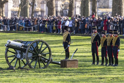 2月7日,英國(guó)士兵在倫敦白金漢宮旁的格林公園鳴放禮炮,慶祝女王伊麗莎白二世登基70周年。