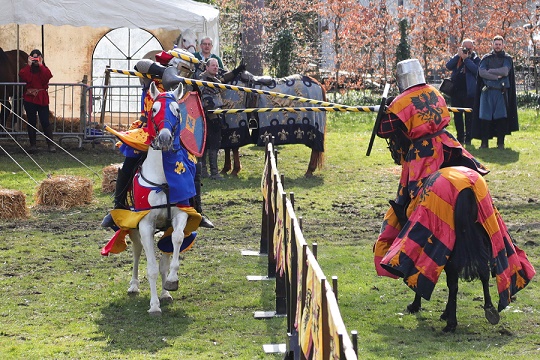 4月10日,身著古裝的騎手在比利時小城烏費的中世紀(jì)風(fēng)情節(jié)上為觀眾表演。