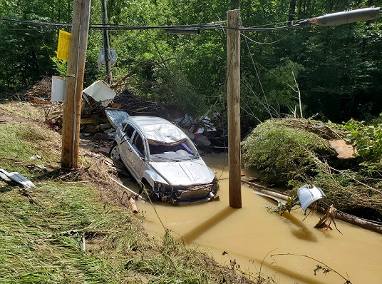 這是7月30日在美國肯塔基州東部阿巴拉契亞山區(qū)拍攝的被損毀的汽車。