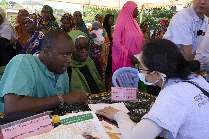 圖為第33期中國(guó)援桑給巴爾醫(yī)療隊(duì)隊(duì)員為當(dāng)?shù)孛癖娞峁┙】底稍兎?wù)。新華社發(fā)(第33期中國(guó)援桑給巴爾醫(yī)療隊(duì)供圖)