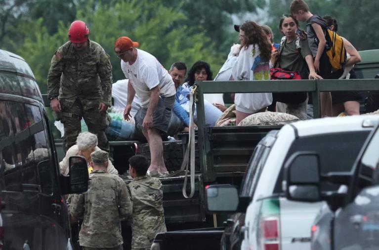 7月4日,在美國得克薩斯州英格勒姆市,應急人員轉移受洪水影響的民眾。新華社/美聯(lián)