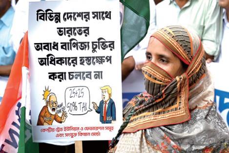 圖為8月13日,印度加爾各答,印度中央工會(huì)組織成員舉行抗議集會(huì),反對(duì)美國(guó)政府對(duì)印度商品征收50%的關(guān)稅。 CFP供圖