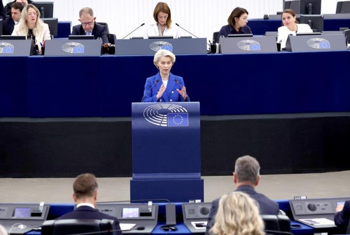 圖為當(dāng)?shù)貢r(shí)間10月8日,法國(guó)斯特拉斯堡,歐盟委員會(huì)主席馮德萊恩在歐洲議會(huì)發(fā)言時(shí)談及構(gòu)筑“無(wú)人機(jī)墻”相關(guān)問(wèn)題。 CFP供圖