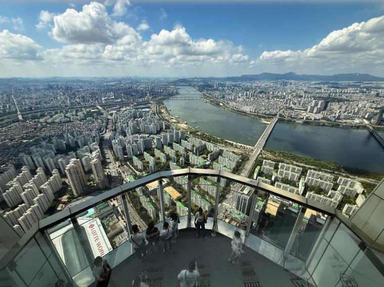 9月5日,游客在首爾的樂天世界塔高層展望臺拍照。新華社發(fā)(全休相攝)